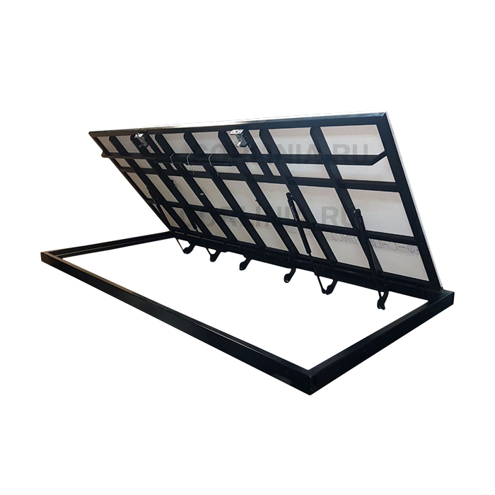 Конструкция выпускается из стальной профтрубы Ст3 50х25 в раме, трубы 30х20 в каркасе дверцы. Мы не перегружаем створки металлом, добиваемся несущей способности сложной многоуровневой обвязкой. Балансируем нагрузку на раму от усилия амортизаторов дополнительным узлом петли по результатам компьютерного моделирования нагрузок.