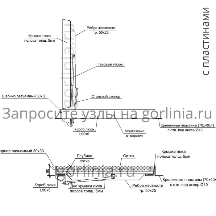Модель с внешними разъемными шарнирами на болтах для возможности покрытия цинком. Механизм с усиленными газлифтами 2000Н, стопорным устройством автоматической фиксации в открытом положении. Запорное устройство на винтах. Две съемные рукоятки по углам для поднятия крышки. Ленточное эластичное уплотнение по притвору.