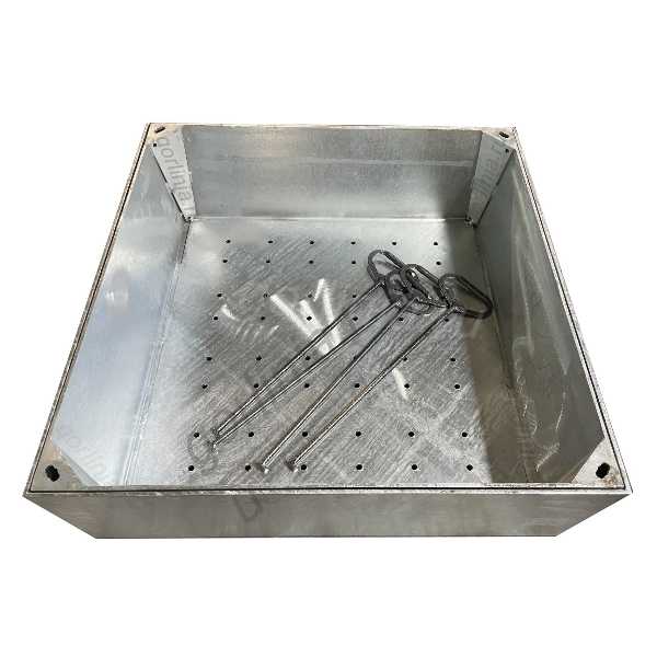 Изделие изготовлено из чернового проката 5мм с покрытием методом горячего цинкования в ваннах с расплавом цинка. Снизу в дне вырезаны дренажные отверстия D10 с шагом 70-100 мм для сходы воды от полива.
