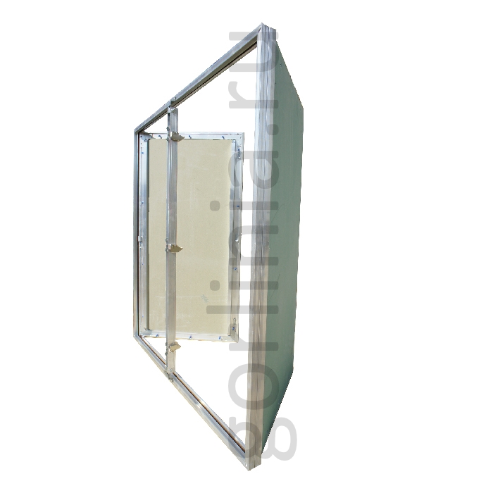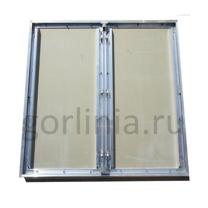 Нажимные створки распахиваются на несъемных петлях с одной осью вращения, дополнительно фиксируется в коробке через съемную перемычку по центру
