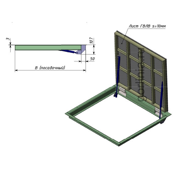 Облегченная модель без щелей в полу со уведенными за ось открывания петлями. Легкая ходовая часть и удобная установка. При формировании конфигурации напольного отверстия обратите внимание, что защитные кожухи шарниров выходят за посадочную отметку по плечевой стороне.