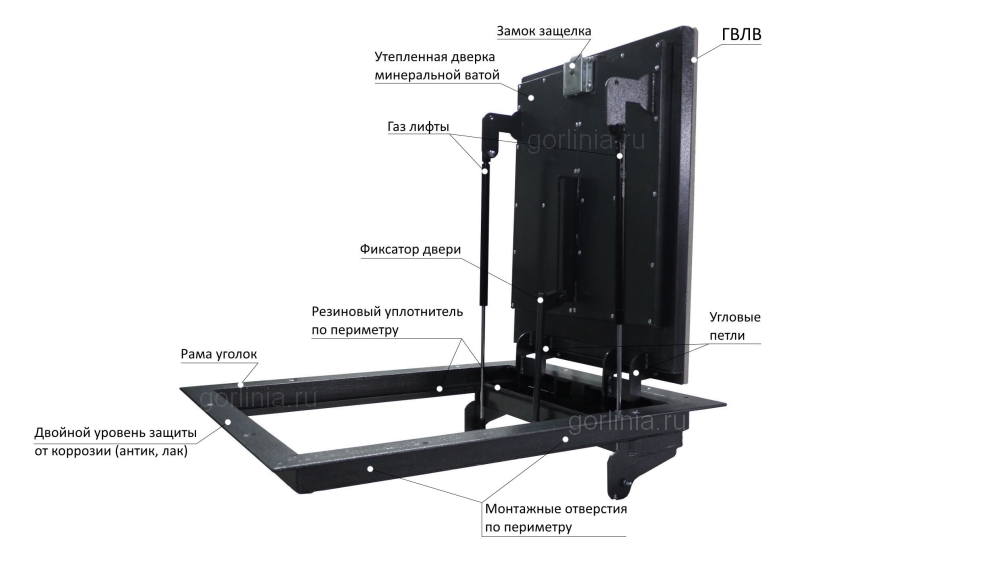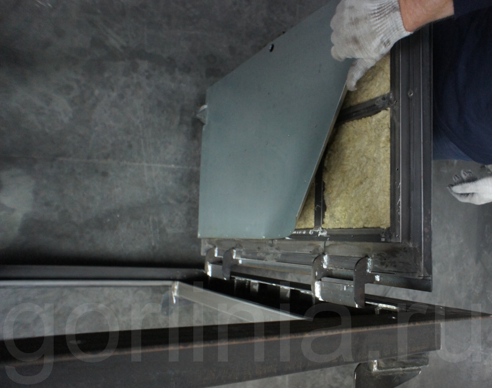 Каркас выполнен из уголка 50х50 мм. Установка производится методом погружения в напольный проем с наличником. Внешний габарит: 690х690 мм.